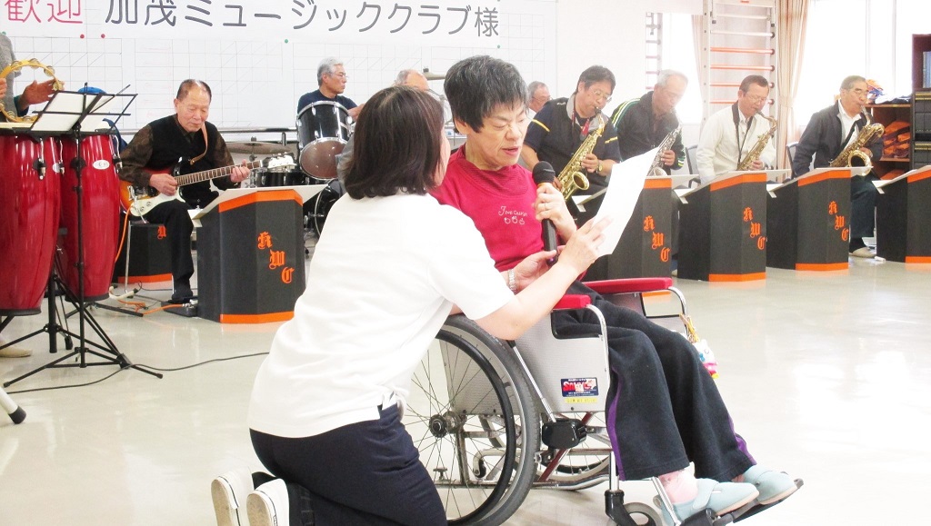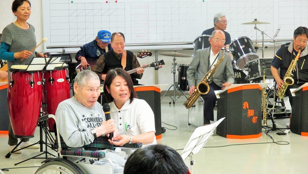 近年は「恥ずかしいから・・・」等の理由により、めっきり演奏を聴くだけになっていましたが、今回は利用者様数名の方が名乗りを上げられ、生バンドの演奏に声を乗せられました。